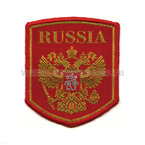 Шеврон тканый RUSSIA (5-уг. с гербом РФ) красн.