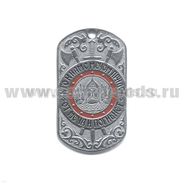 Жетон (нерж. ст., эмал.) Кто к нам с мечом придет, от меча и погибнет (богатырь и топоры)