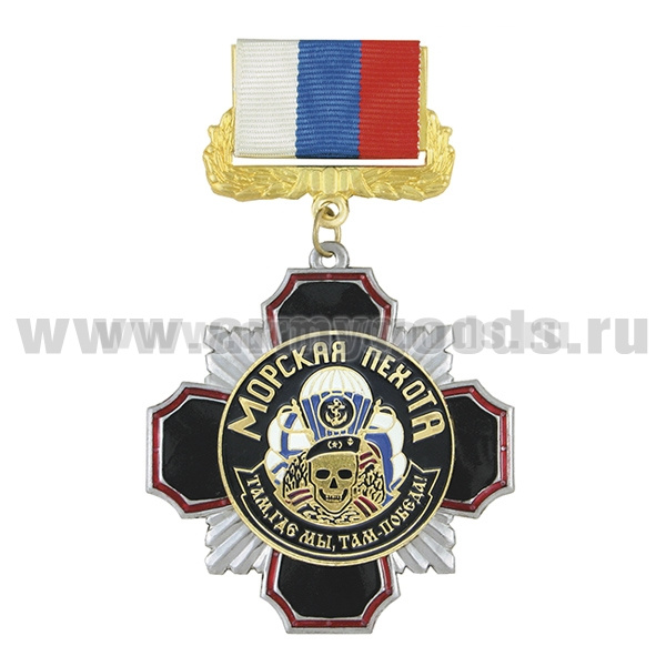 Медаль Стальной черн. крест с красн. кантом Морская пехота (Там, где мы, там - победа!) на планке - лента РФ