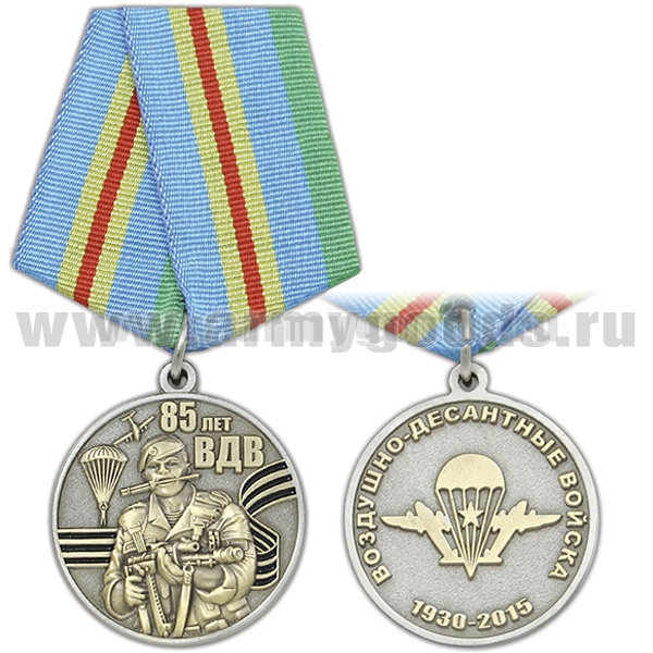 Медаль 85 лет ВДВ (1930-2015) десантник с автоматом и ножом на фоне Гвардейской ленты