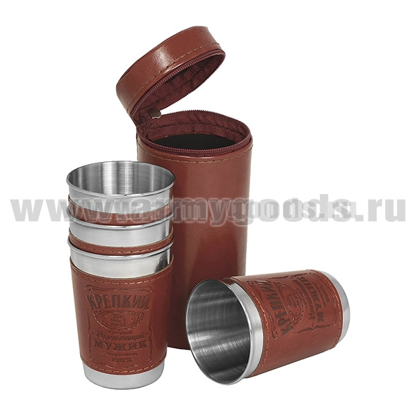 Стопки мет. (4х125 мл) с тиснением на коже Крепкий, суровый настоящий мужик (в чехле)