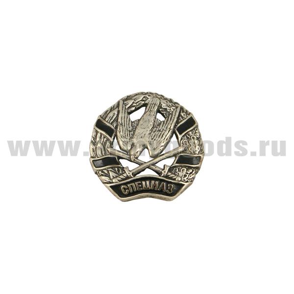 Значок мет. Спецназ (пикирующая птица над перекрещенными мечами, в венке с черной лентой) мал., на пимсе