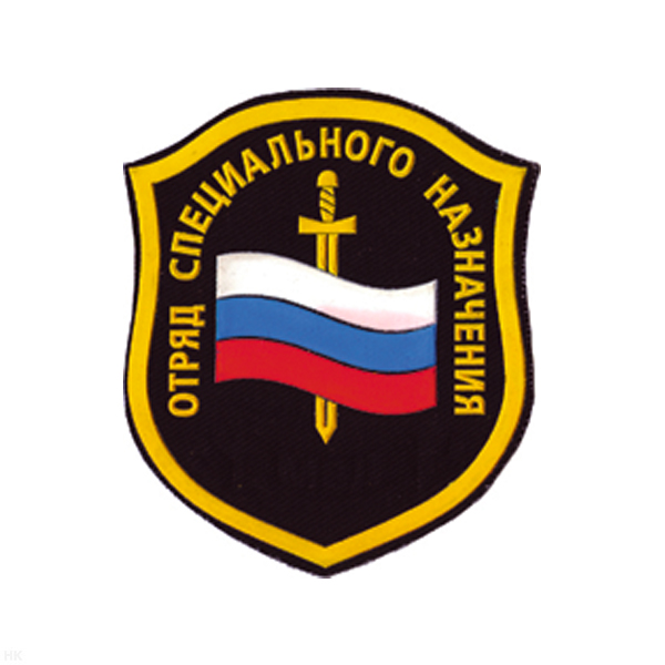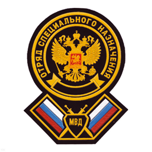 Шеврон пластизолевый Отряд спецназ МВД (круг с орлом РФ, под кругом 2 флага РФ, между ними щит с 2 мечами, внути щита надп. "МВД")