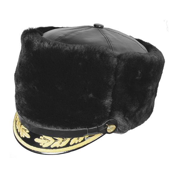 Шапка нат. мех овчина черная, верх - кожа (вышитый козырек - канитель золото 3%)