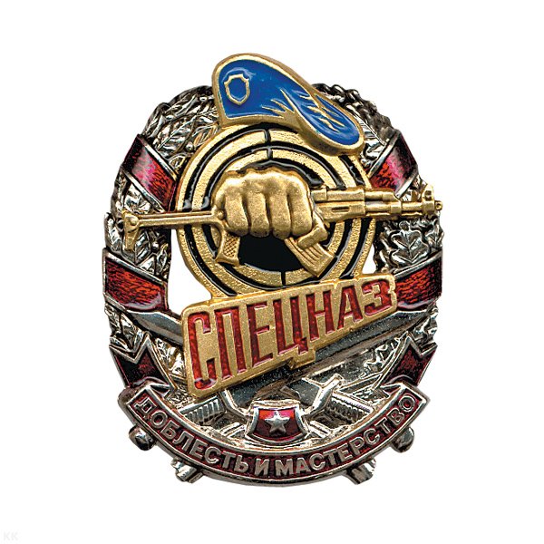 Значок мет. Спецназ Доблесть и мастерство (кулак с автоматом в венке) голуб. берет