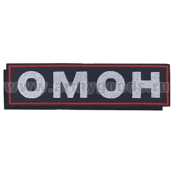 Нашивка на спину вышит. ОМОН (иссиня-черный фон, красный кант, белые буквы) на липучке