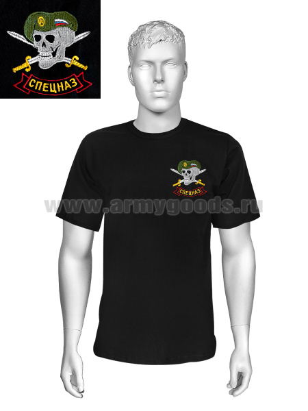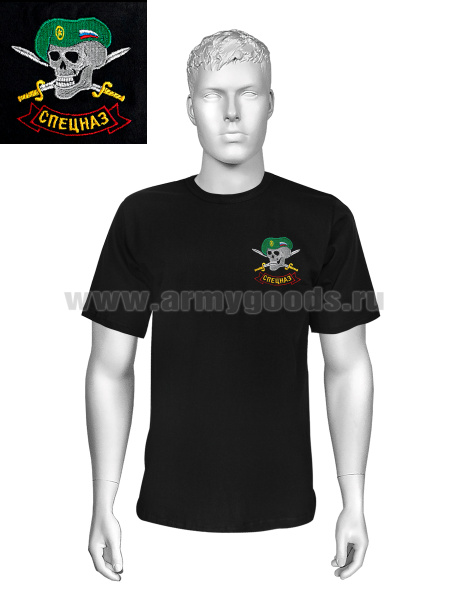 Футболка с вышивкой на груди Спецназ (череп в краповом берете) черн.
