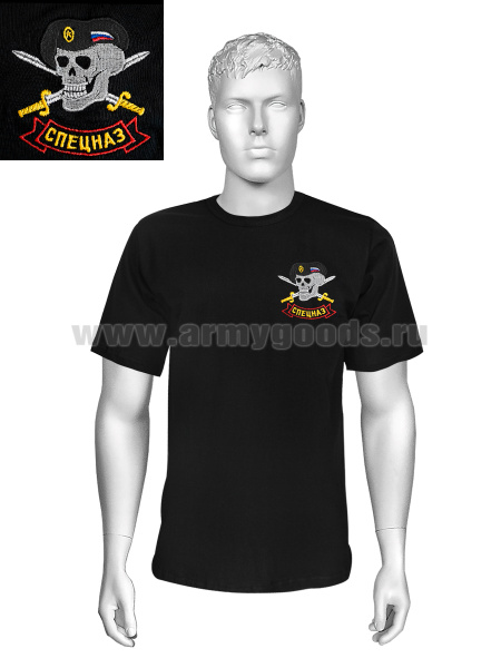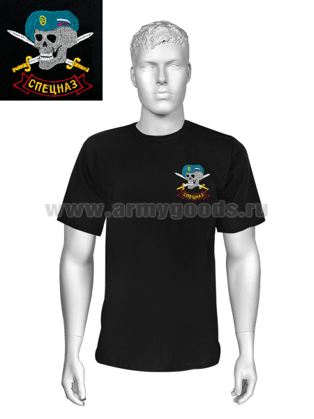 Футболка с вышивкой на груди Спецназ (череп в черном берете) черн.
