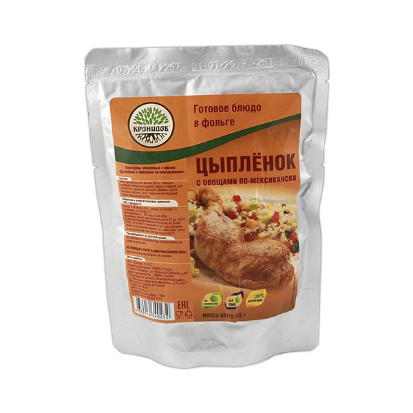 Главная-05 СНАРЯЖЕНИЕ-Консервы обеденные Цыпленок с овощами по-мексикански (325 г) (готовое блюдо в фольге)