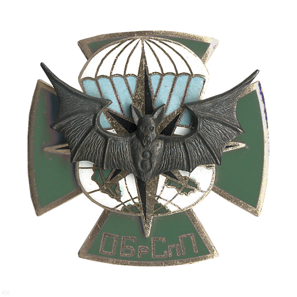 Значок мет. ОБрСпП летуч. мышь, крест (зел.) гор. эм.