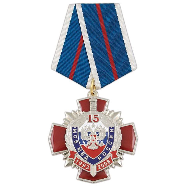 Медаль 15 лет МОБ МВД России 1993-2008 (красн. крест, смола с накл. серебр. щитом и мечом)